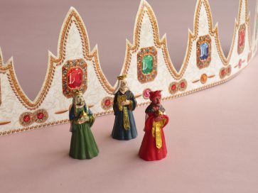スペインでは1⽉6⽇(キリスト教の公現節の⽇)にキリストの誕⽣を祝い、この王様たちのリングケーキ、ロスコン‧デ‧レイエスを⾷べます。⼈形Figuraとそら⾖Habaが別添されています。